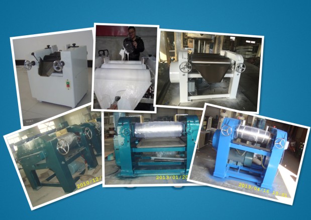 該設備由三個輥筒組成,裝在一個機架上,由電機直接帶動。一般輥筒間的轉(zhuǎn)動方向不同,前輥向前轉(zhuǎn)動,中輥向后轉(zhuǎn)動。輥子轉(zhuǎn)速前輥快、后輥慢。中間輥固定,前后兩輥裝在滑道上,有彈簧裝置,用手輪調(diào)節(jié)前后輥與中輥的距離。物料由后輥與中輥之間進入,受到輥筒的擠壓,產(chǎn)品顆粒變細,然后由快輥帶出,快輥末端裝有刮刀,使物料與輥筒分離,落入收集桶內(nèi)。由于研磨過程產(chǎn)生大量熱量,各輥筒的中心是設計為空心結(jié)構(gòu),通水冷卻,保證產(chǎn)品質(zhì)量。